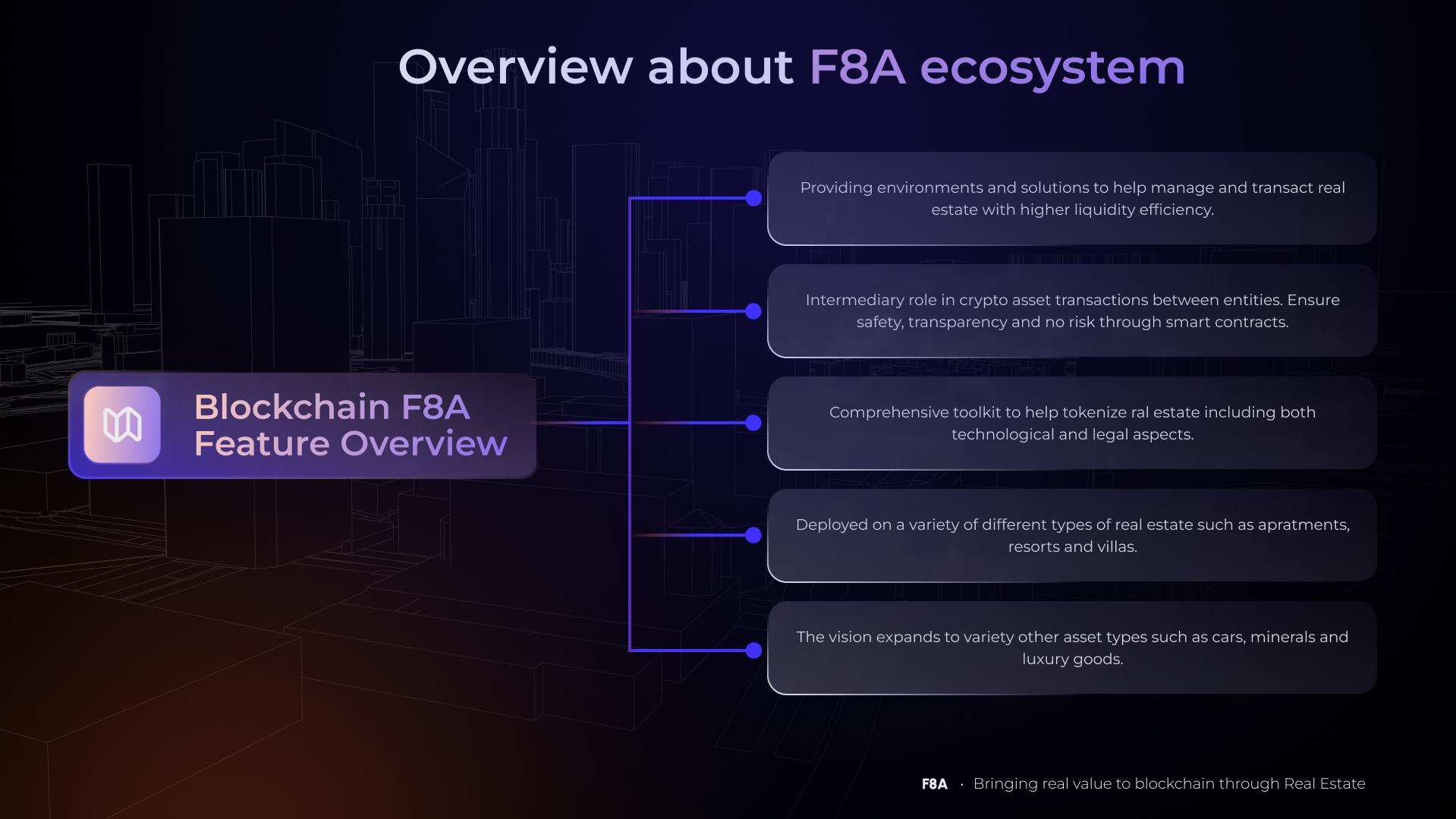 F8A Chain serves as a foundational blockchain infrastructure uniquely crafted to cater to the intricate needs of real estate businesses looking to tokenize their assets. By providing a robust and reliable platform, F8A Chain empowers real estate enterprises to leverage the transformative potential of blockchain technology while navigating the complexities associated with asset tokenization.&#x20;